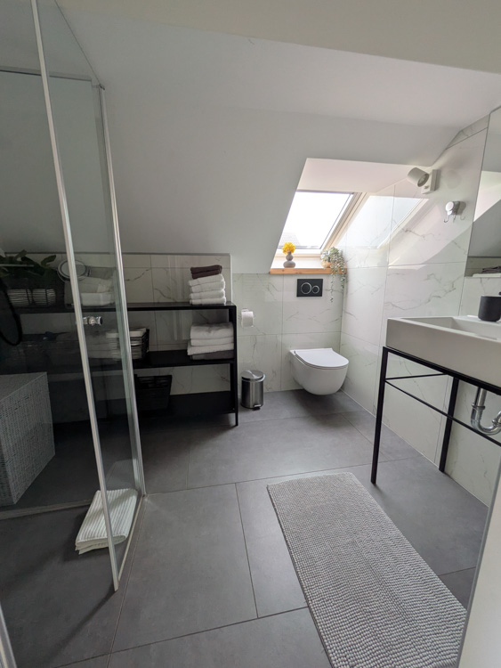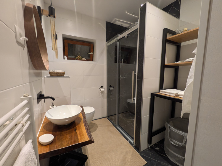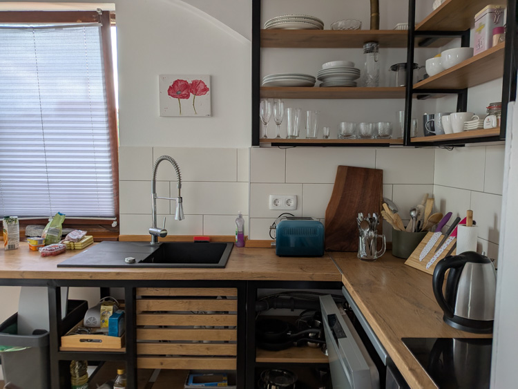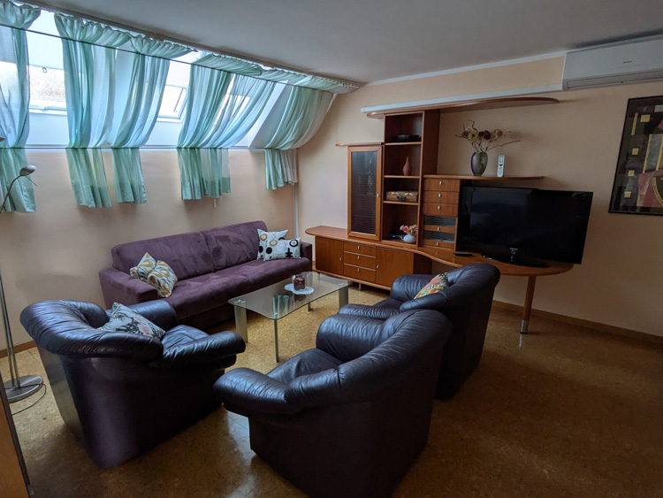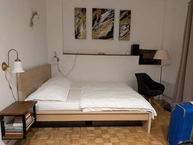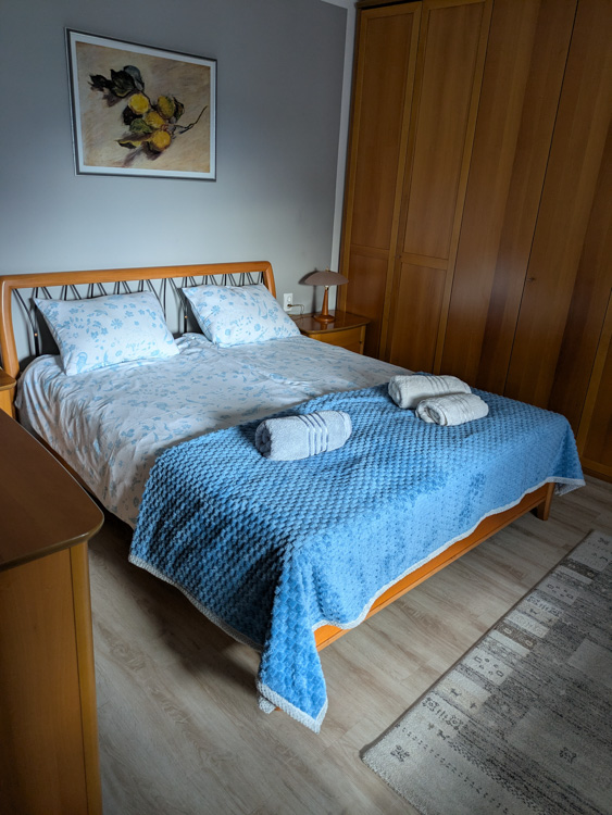 The owner met us to give us the key and show us the place. Large living space with full living room, 2 bedrooms. Fairly quiet even in the center of town. Good water pressure in shower and on-demand hot water worked fine. Kitchen had lots of utensils and pans, just about everything we could need. We also appreciated the washing machine and large drying rack. Disliked – Wifi was slow and the mattress was a bit hard for us side-sleepers. No coffee.