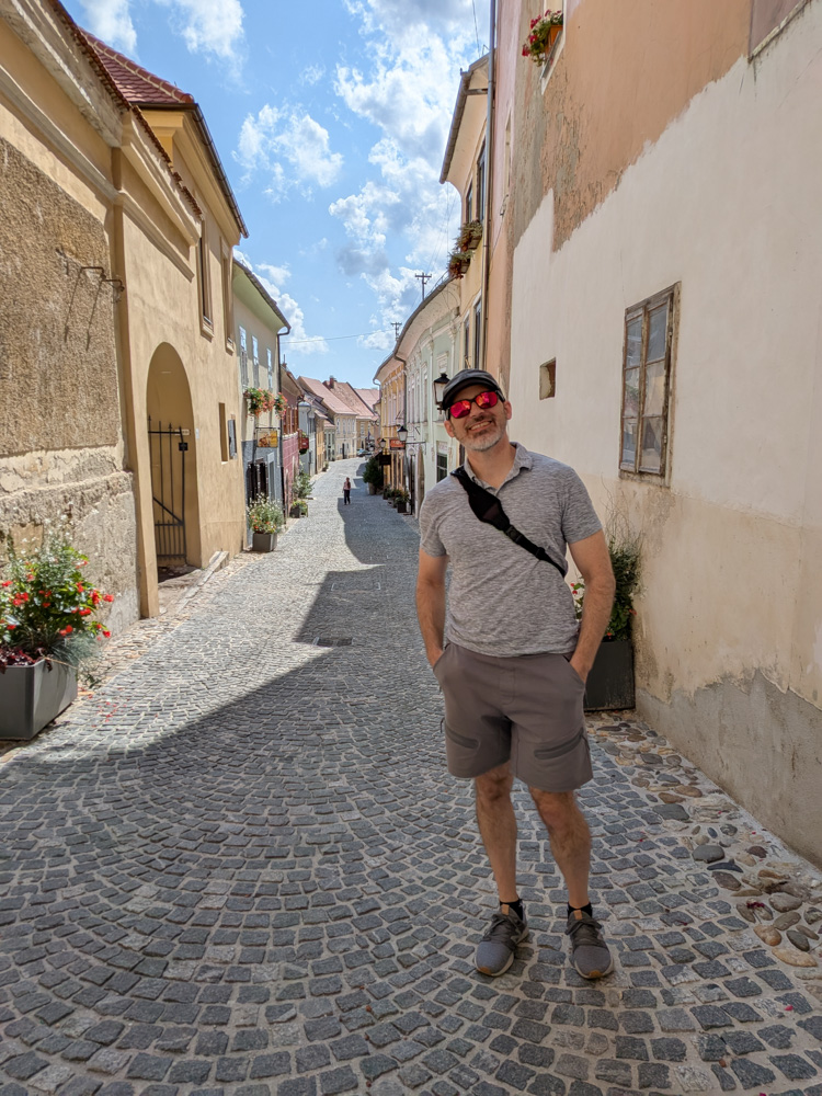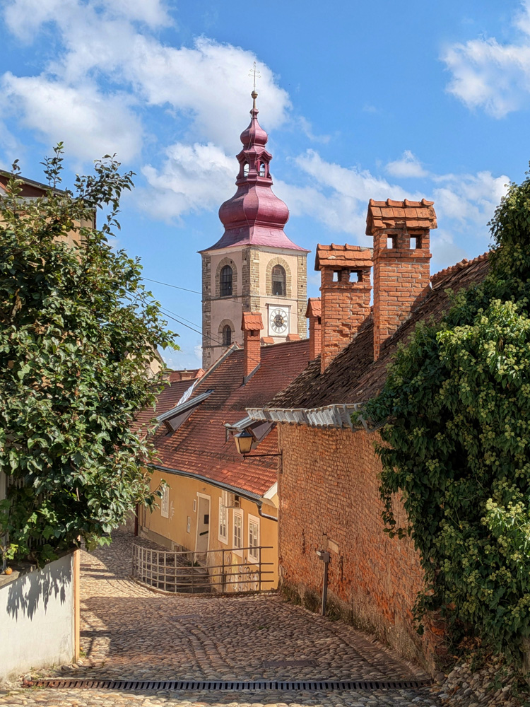 In Ptuj we found a free parking lot next to the castle on the edge of town and made that our first stop. We also had some lovely views as we descended from the castle into the city center, then wound our way through to the opposite side of town. Ultimately, Eric thought the best views were from the pedestrian bridge.
