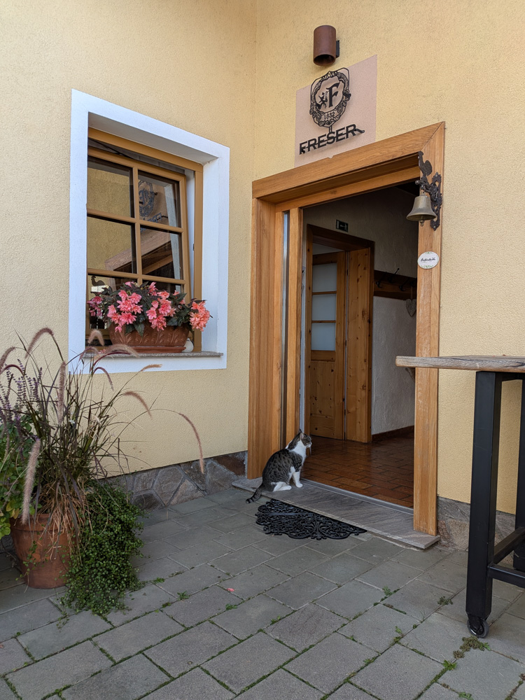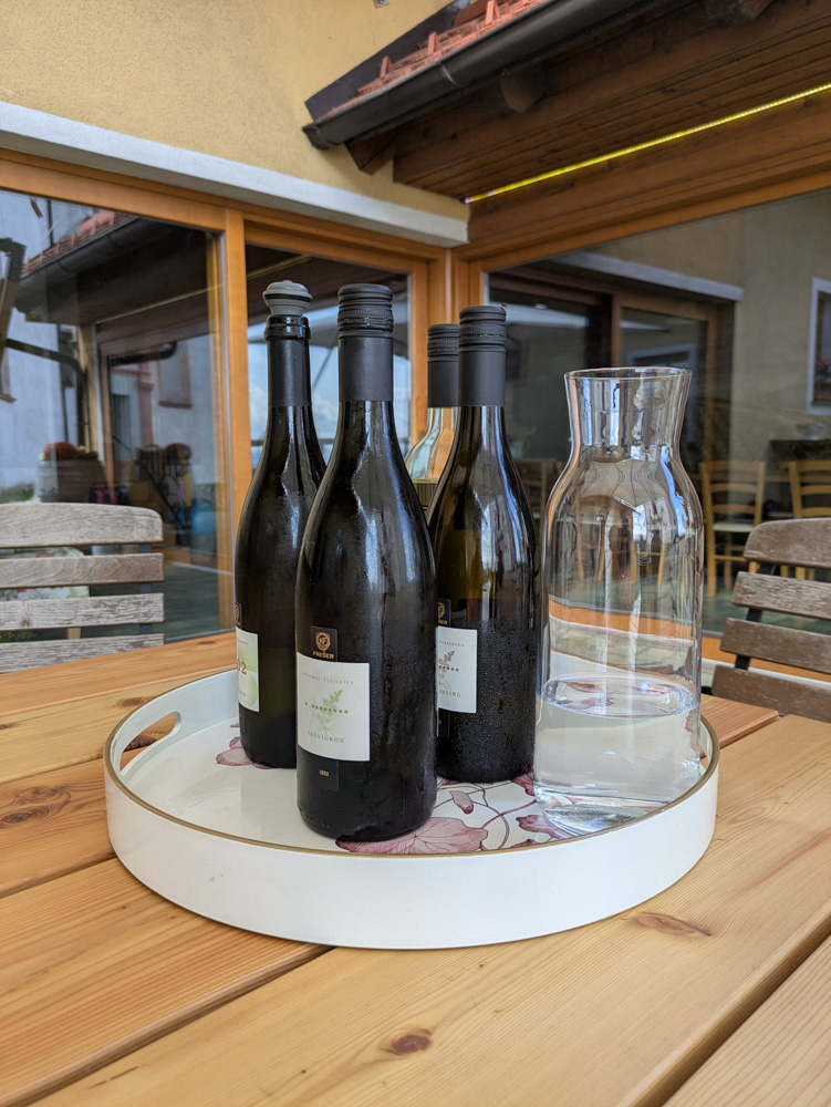 Andrea was our host and she did a lovely job of describing the wines, their wine-making philosophy and generally making us feel welcome. We enjoyed our tasting at a wooden table in their shaded courtyard, along with the shenanigans of their two cats. In all we tried seven wines, six whites and one red.