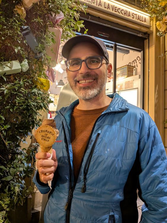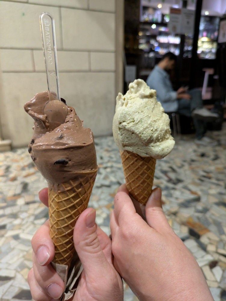 Bologna is a food city, including for gelato. We set out to try most of the top-rated gelaterie and definitely had a few favorites. I generally stuck with pistachio but also discovered ‘crema’ as a new favored flavor on this trip. Eric typically went for some sort of rich chocolate and a complementary flavor.