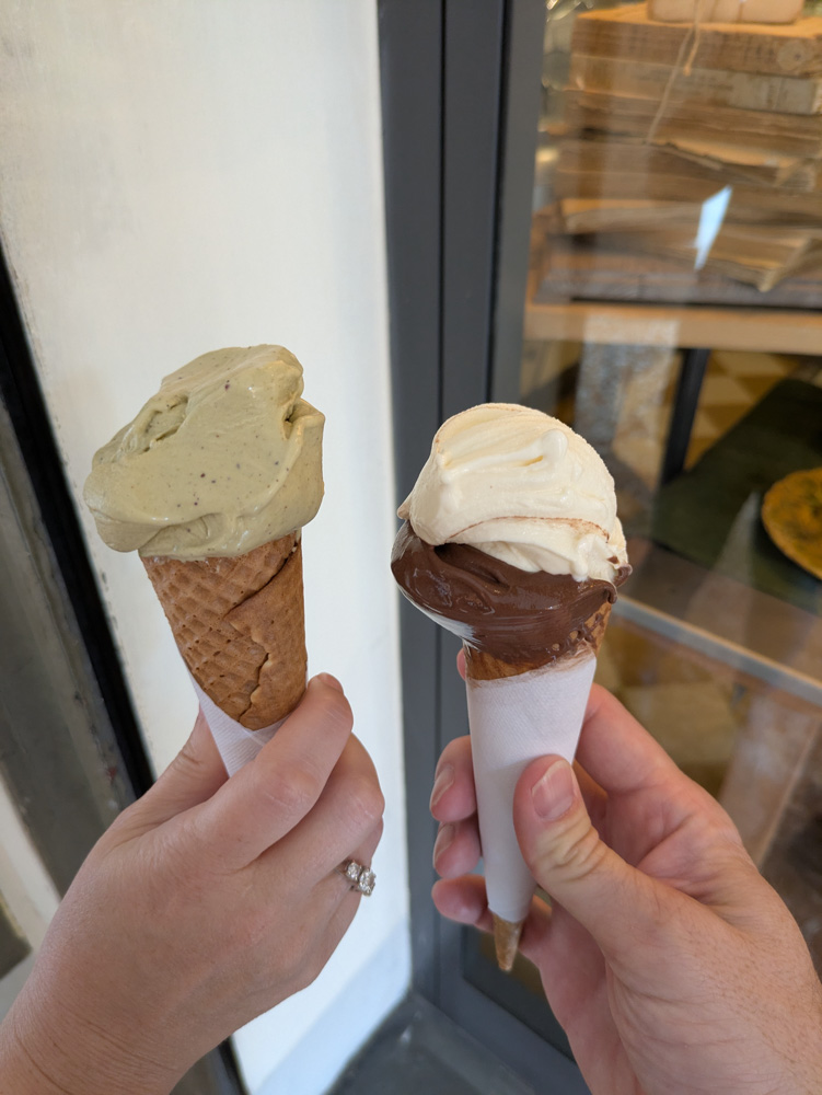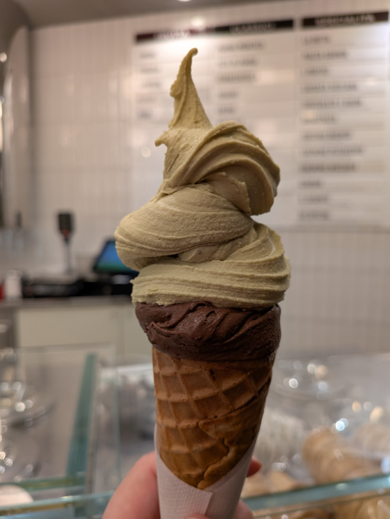 So good we went twice! Eric got the chocolate and their famous white coffee Cafe Bianco cafe on our first trip, and it was so good he ordered the same on the second trip. I got the salted pistachio (one of my faves of the trip) and crema on the first trip and ALL pistachio (salted and regular) on our second visit. They definitely belong in the lists of top gelato spots in the city.
