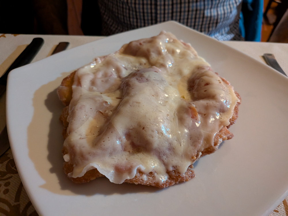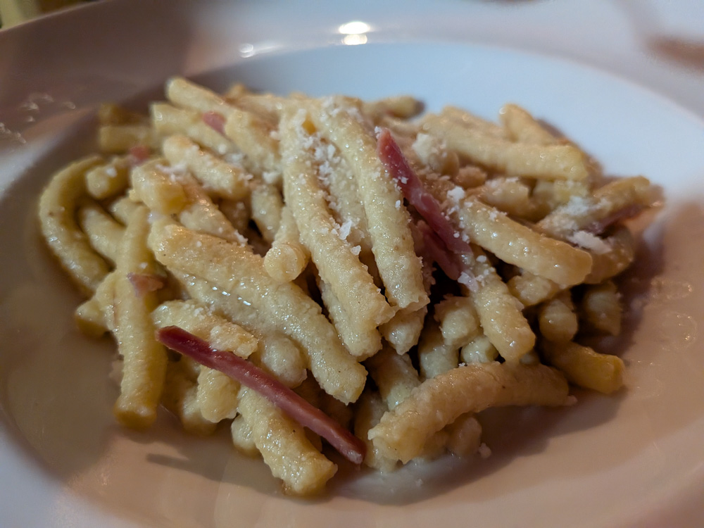 For dinner, we each got a half liter of house wine, red for me and white for Eric, as it was a fantastic deal. We started with the pecorino and honey plate, then Eric had a pork cutlet with ham and cheese for his main and I had the Gramigna pasta with sausage. Everything was excellent – highly recommended!