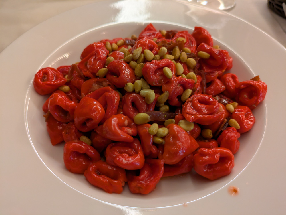I Panini di Mirò – very busy on a sunny Sunday afternoon! I grabbed a table just as someone left, planted Eric to save our spot, then stood in line to order. It wasn’t obvious, but I figured out I had to grab a notepad, write my order on a sheet a paper at the counter, and hand it to the staff. We decided to split a porchetta sandwich with dried tomato and cheese. I never saw a wine list and the red and white glasses I ordered for us were serviceable but it would have been nice to have a selection. They deliver to your table by yelling names; mine fit in with all the Italian names :) The bread was amazing and the pork was very flavorful. Could have used more tomato in our opinion, but overall very good.  The street hosts several other outdoor restaurants so we walked down to check a few more out.