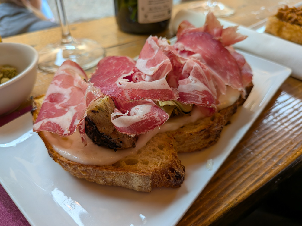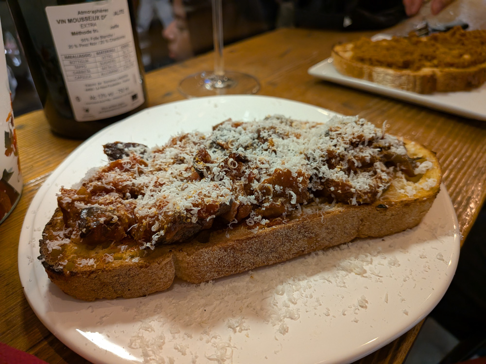 Tannino – Bruschette e Vino – The first time we stopped in because many other places were full and we scored two seats in the front window. We decided to split a bottle of Franciacorta (fine bubbles with almond pastry nose, sweet yeast, apple cider, and hazelnuts – quite autumnal!) and ordered a bruschette each, the Bologna mia with meat sauce (amazing) for Eric, while I had the Tempesta with ndjua, eggplant caponata, and salted cacioricotta cheese. Very eggplant forward and a tad too bitter for me.