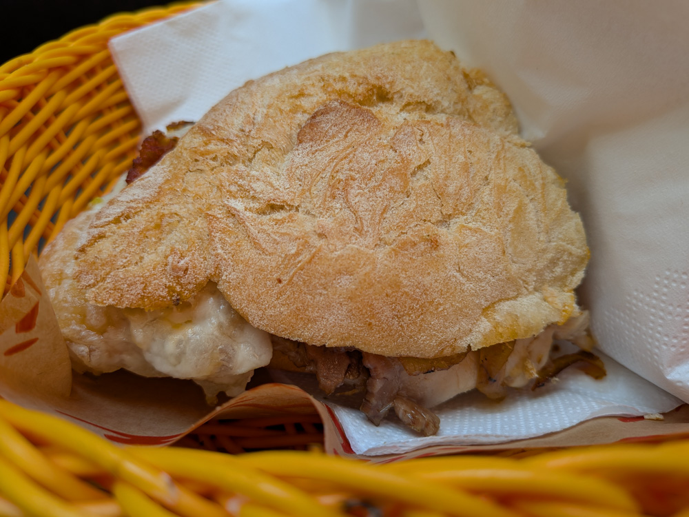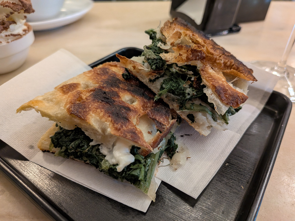 Bella Riva caffè dal 1979 – Eric bookmarked this place so we could try their pinsa sandwiches (a Roman dough that is lighter and airier). We stopped in for lunch, found a table and ordered at the bar. Eric had the mortadella, Stracciatella, and pistachio pesto and I got the mozzarella and greens, plus a lagrein wine. Eric’s hot chocolate was the star of the meal, with a generous side of whipped cream!