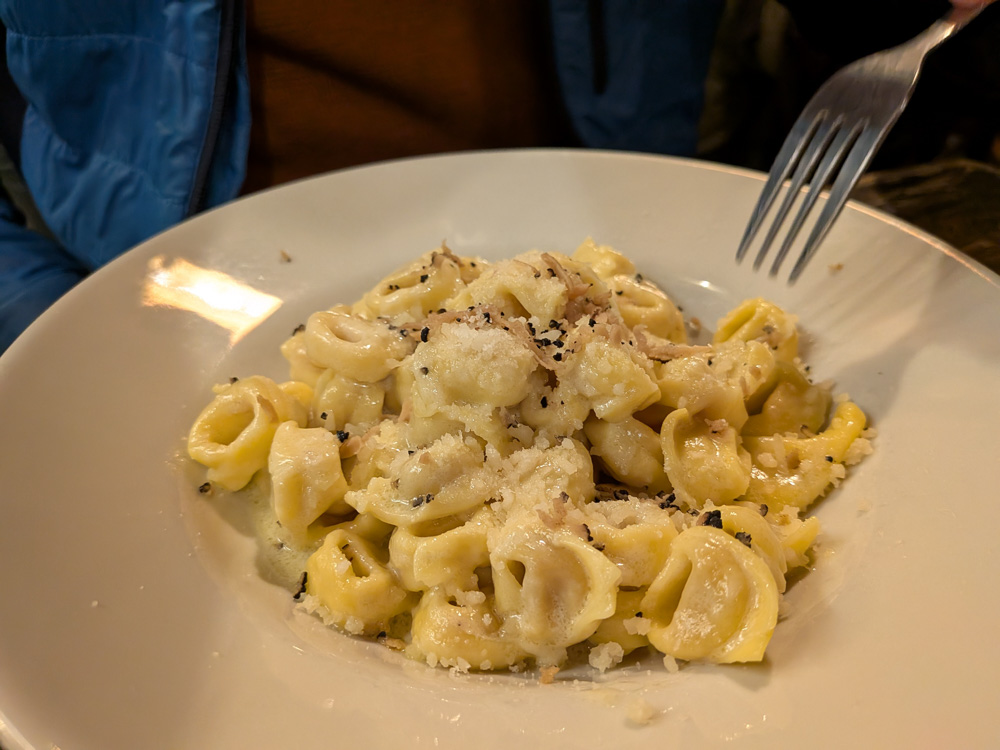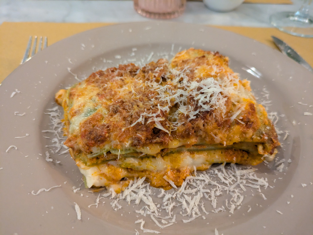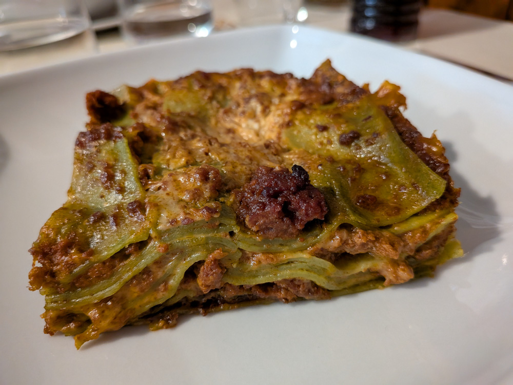 Trattoria Valerio – close to our apartment, we visited here twice, first for lunch and then for dinner with a reservation made in person. For lunch we arrived right as they opened and scored an available table; several tables had reserved signs and the small place filled up quick. Eric ordered the tortellini en brodo (delicate broth, meaty tortellini), and I had the Bolognese lasagna (decadent and delicious!)