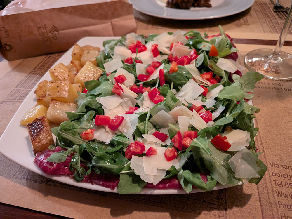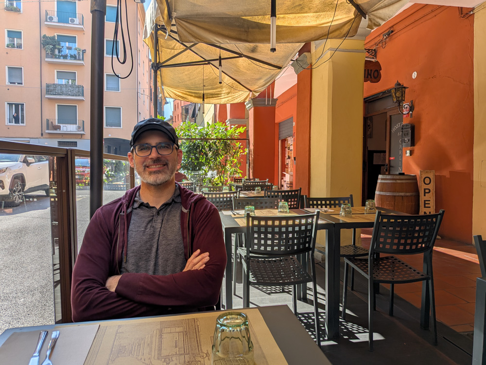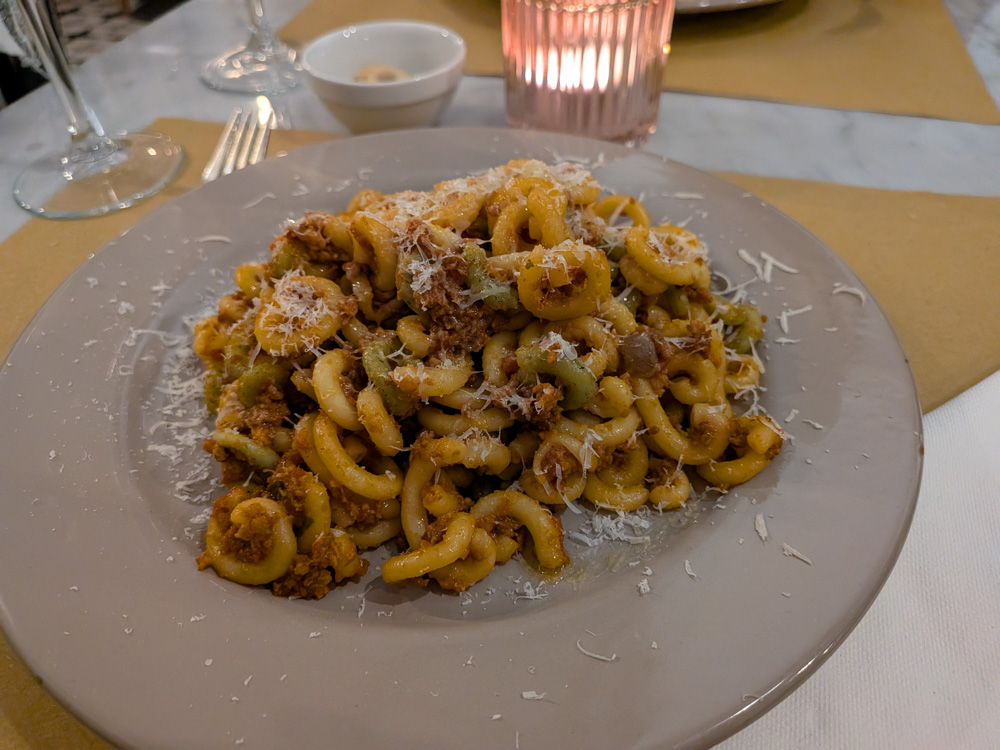 ScemuÁ Bistrot – located at the end of Via del Pratello, the menu looked different than some other places in town, so I made us a reservation for a mid-week dinner. We started with a bottle of Prosecco miol millesemato 2024 and ordered a piadina with prosciutto, fontina and arugula as an appetizer. We each ordered a pasta for our main course, the lasagna for Eric (amazing) and I managed to score the last plate of Gramigna with sausage. Everything was excellent, including the friendly service!