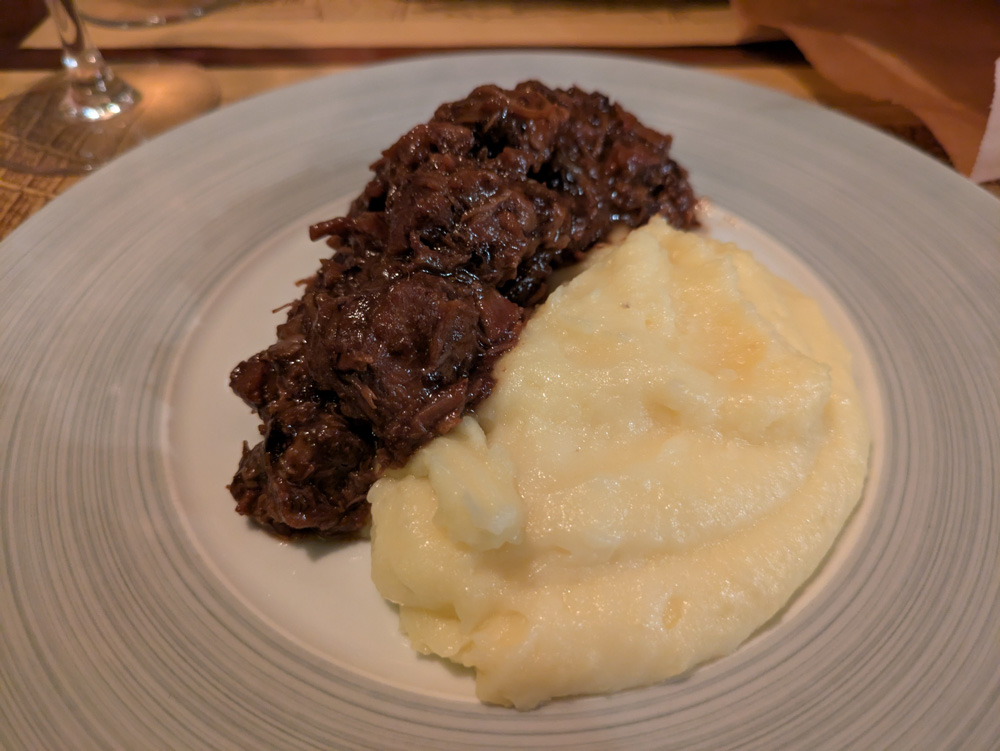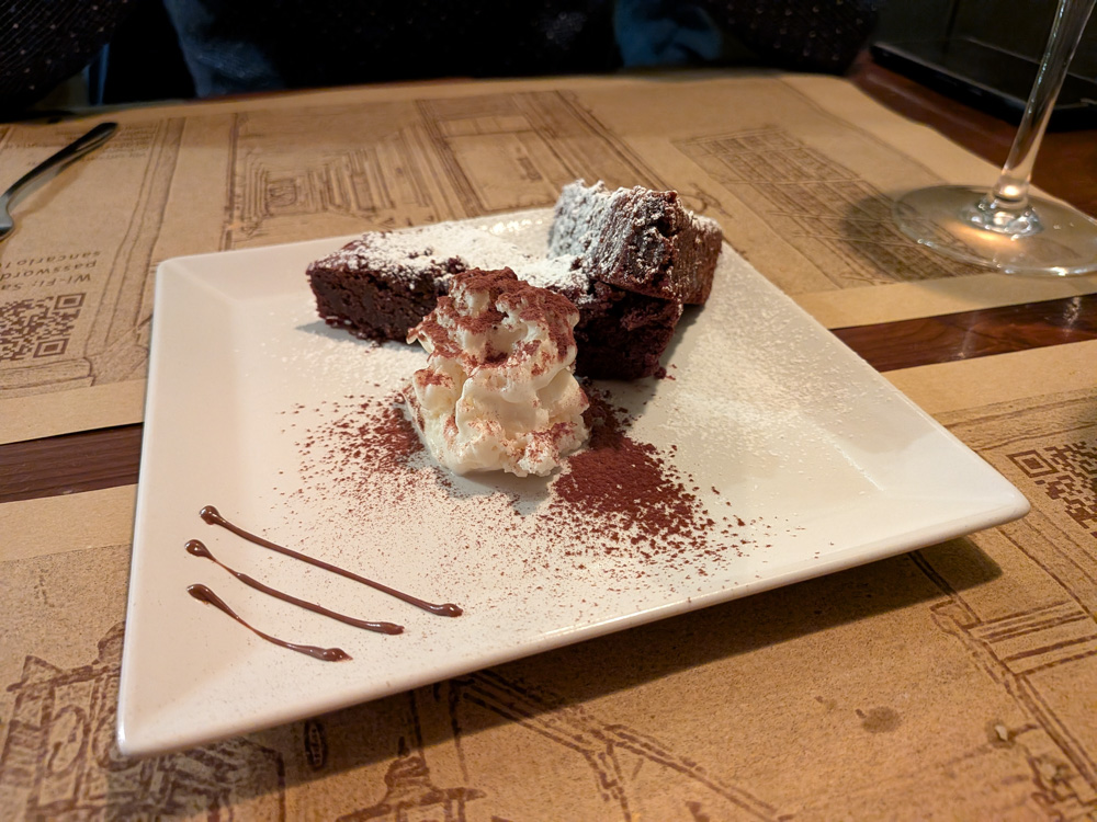 Hostaria San Carlino – visited twice, once for dinner in the basement (with wifi to access the online menu thank goodness) and again for lunch outside in the sunshine. The first time Eric ordered the pork cheek in plum sauce with mashed potato (amazing) and I had the beef carpaccio with arugula and potatoes (also very good) that was absolutely covered in a salad. We paired those dishes with the La Mancina Barbera sparkling rose which went great with everything. Somehow we left room for the chocolate torta tenerina… airy, but so rich. The downstairs was cozy and service was pleasant, overall a great meal and very glad we had reservations given how busy they were.