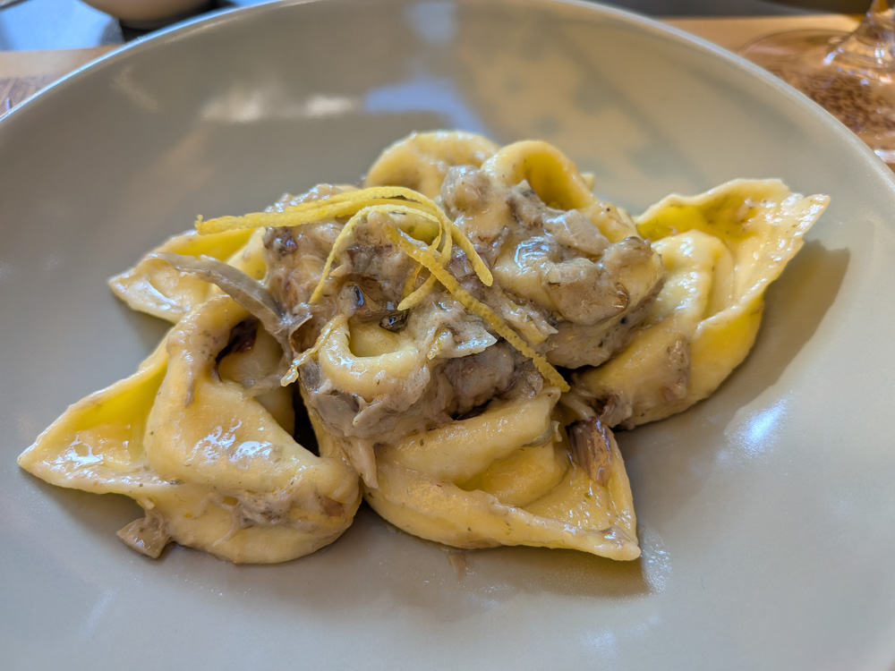 il Passatello di Bologna – Easy to make a reservation via WhatsApp. Eric had the passatelli with prosciutto, while I went for tortellini with porcini mushrooms. The tortellini were larger than the broth based ones and filled with ricotta – the mushrooms were delicious. We split a bottle of the Bel star Valdobbiadene prosecco (light peach, tropical fruit and vanilla, fine bubbles). Very light and nice on a warm evening! The chocolate dessert was also divine, a tenerina al cioccolato with marscapone cream.