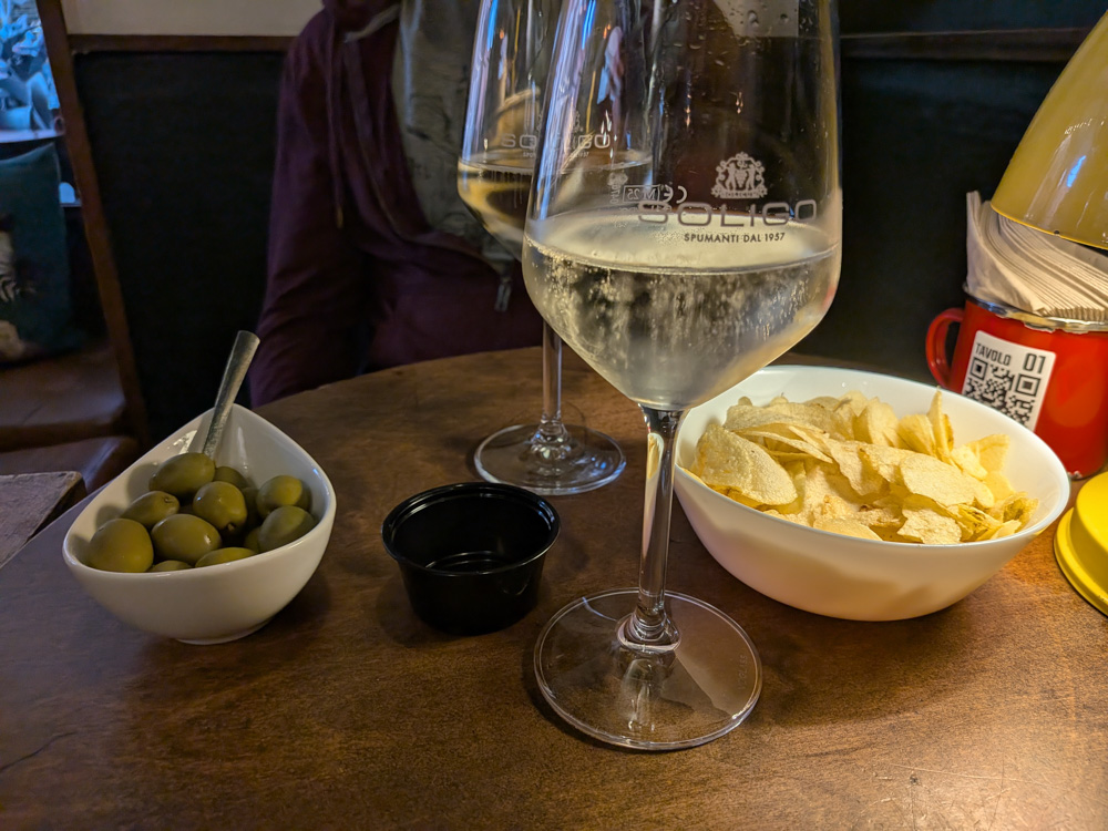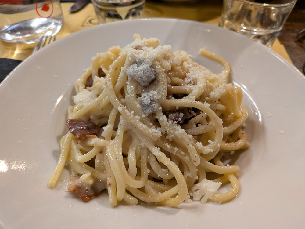 Marsalino – when making the reservation during warmer weather I had requested outside and although it was a cool evening, it was still pleasant. The restaurant was quite busy, there was always a queue of people waiting for tables. I had a glass of Sangiovese paired with the Spaghetti Alla grecia with smoked guanicale and Eric got a Rosato (nice and big with medium finish and some bitterness) and the Tortellini with tartufo – first truffles in Bologna! Overall, service was good, and the food here was solid but not memorable. Bread was on the stale side, rather disappointing, and their dessert menu didn’t look interesting either.
