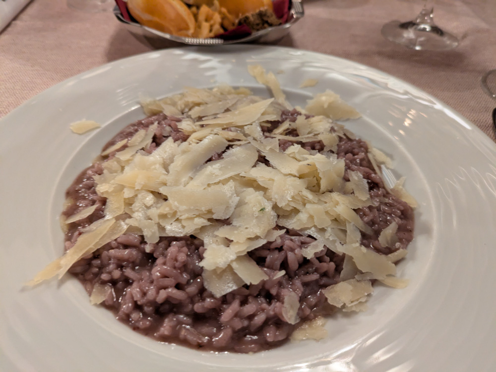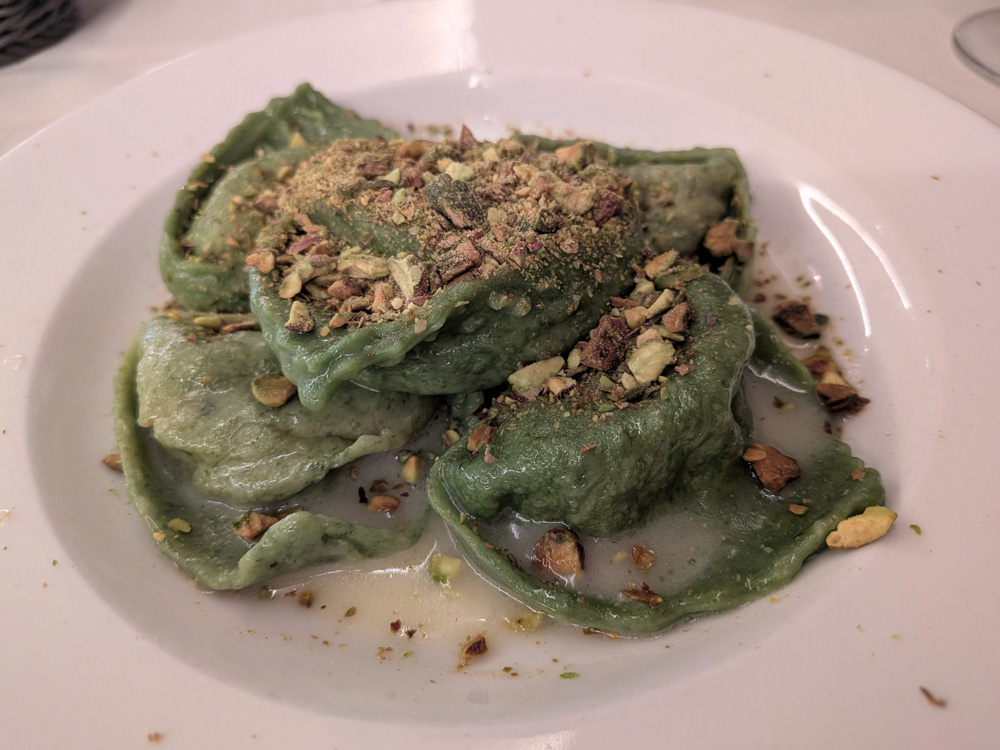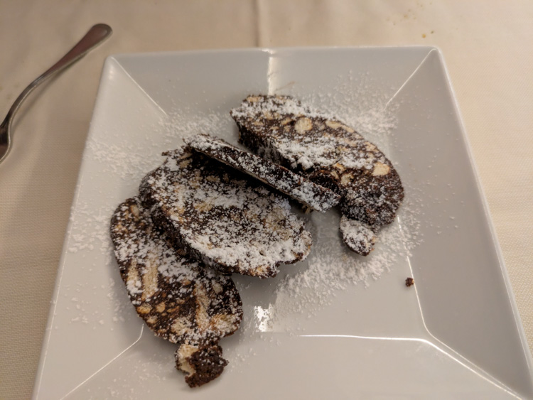 Trattoria Nonna Gigia – we went twice for dinner, once at the beginning of the trip and again near the end. We showed up the first time without a reservation and were offered a table from 7:45p until 9pm – no problem! Bread basket included focaccia bites and gnocco fritto (fried flat dough). Eric ordered the (very red!) tortellini with prosciutto and pine nuts paired with a rosé, and I got the (very green!) ravioli with mortadella and pistachio paired with a Sangiovese. For dessert we tried the chocolate salami – no meat in it! Cocoa-y with biscuits, it was quite tasty as well.