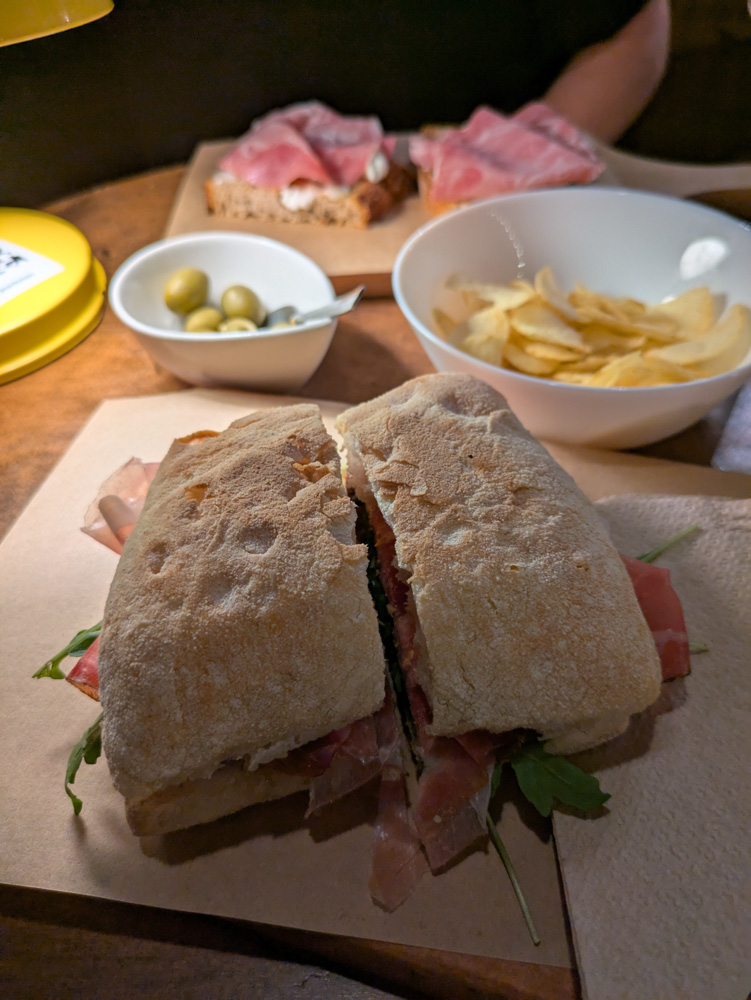 Fabrik” – another favorite from a previous trip, we had a lovely aperitivo / dinner here on a relaxing Sunday. Our reservation scored us the same two seater corner table we got last time! We split a bottle of Soligo Col De Mez DOCG Brut prosecco with complimentary potato chips (really nice!) and olives. For dinner, Eric ordered a custom panini with ham, parmesan cream, sundried tomato and arugula, while I had a bruschette with salami rosa, squacquerone cheese and honey.