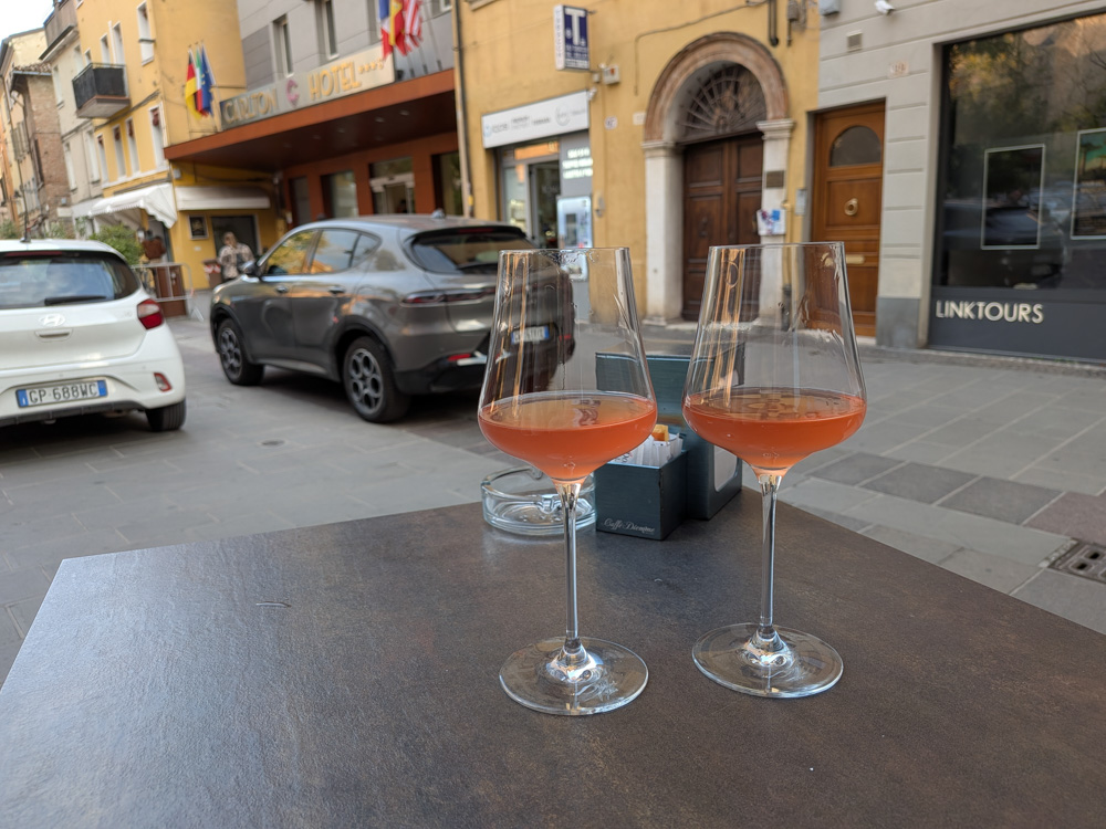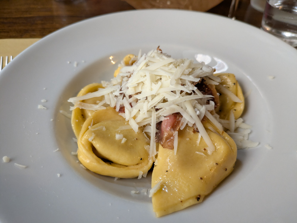 For lunch we had reservations at Trattoria da Noemi. It was empty at 12:30p, and completely filled by 1:30p. Cappellacci is the signature pasta of the town, so we each got one. Leandra had hers with ragu; for wine, the primitivo and a montepulciano for her second. I tried the cappellacci di zucca (squash), guanciale and pecorino, plus a passerina wine. Portions were big, we were stuffed, and service was friendly and efficient. Also a nice bonus that still or sparkling water and bread was included with the coperto (service charge).