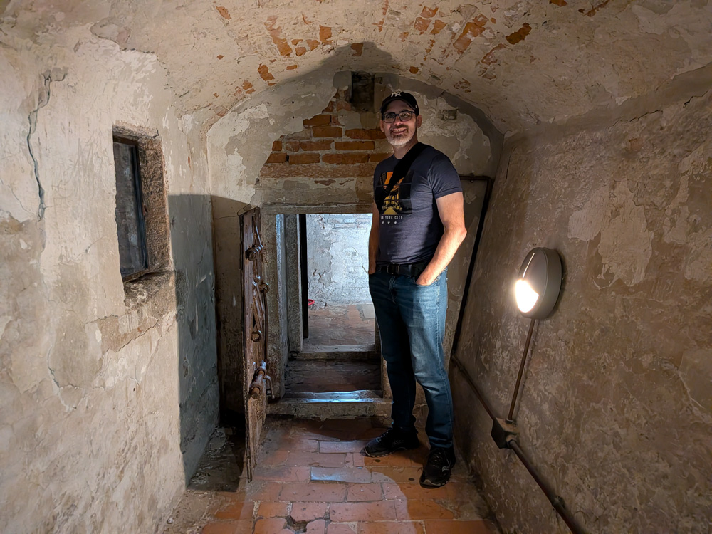 Returning to Castello Estense, we had our tickets stamped and checked out the interior. There was a lot more reading than expected. Inside we saw from the bottom (the dungeon had small doors) to the very top (nice views from orange patio and tower). Many of the ceilings are painted, and the mirrors that let you observe without straining our necks were appreciated! We also saw several illuminated manuscripts.