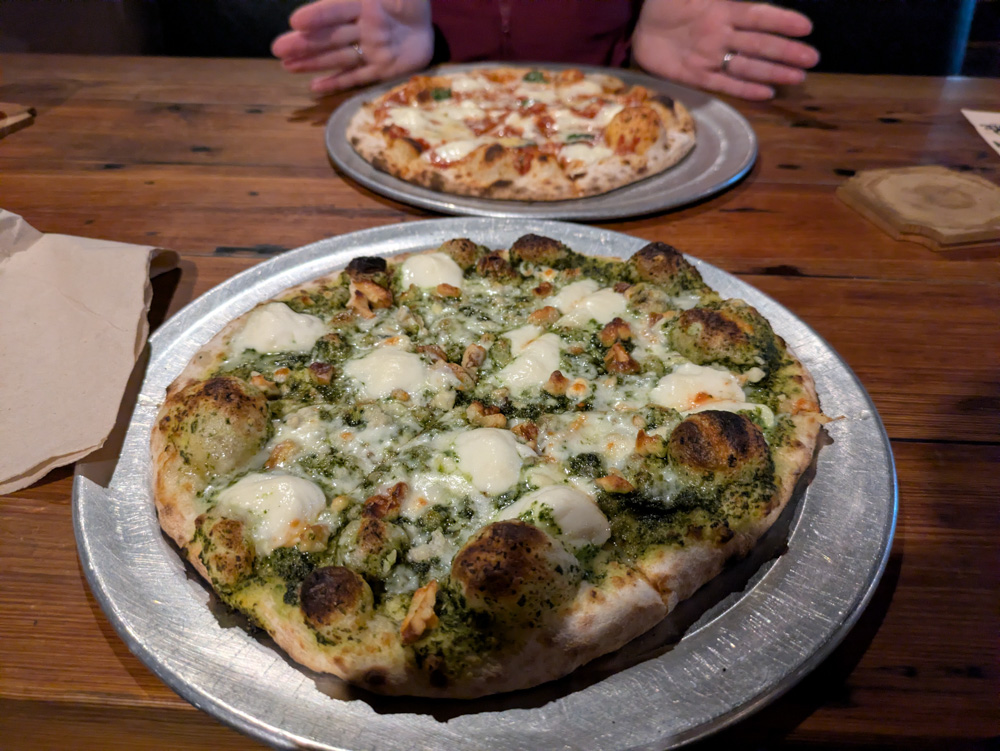 Humble Pie Wood Fired Pizza – Ordered two pizzas for takeaway, which were delivered to our table at the brewery next door. Nice! We got one margherita and one with walnuts and pesto. Crust was proper crispy and flavors were solid.