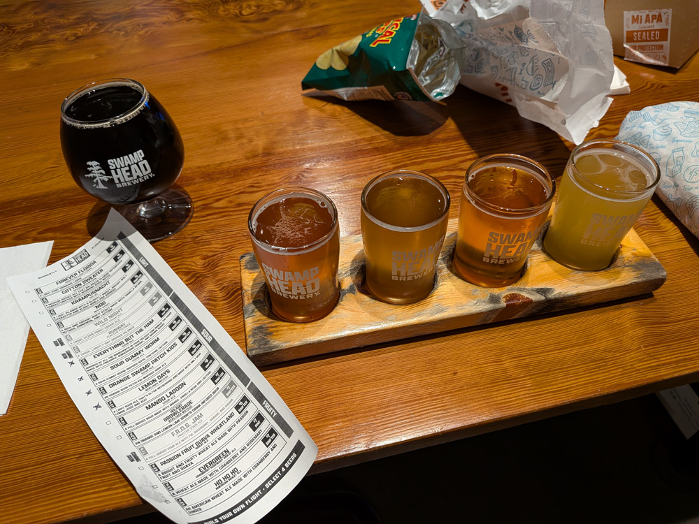 Swamp Head Brewing – Located farther from downtown, close to the interstate in an industrial area, this brewery has a huge tasting room and outdoor seating area. Eric couldn’t decide what sour beer to try so he got a sampler for $12: