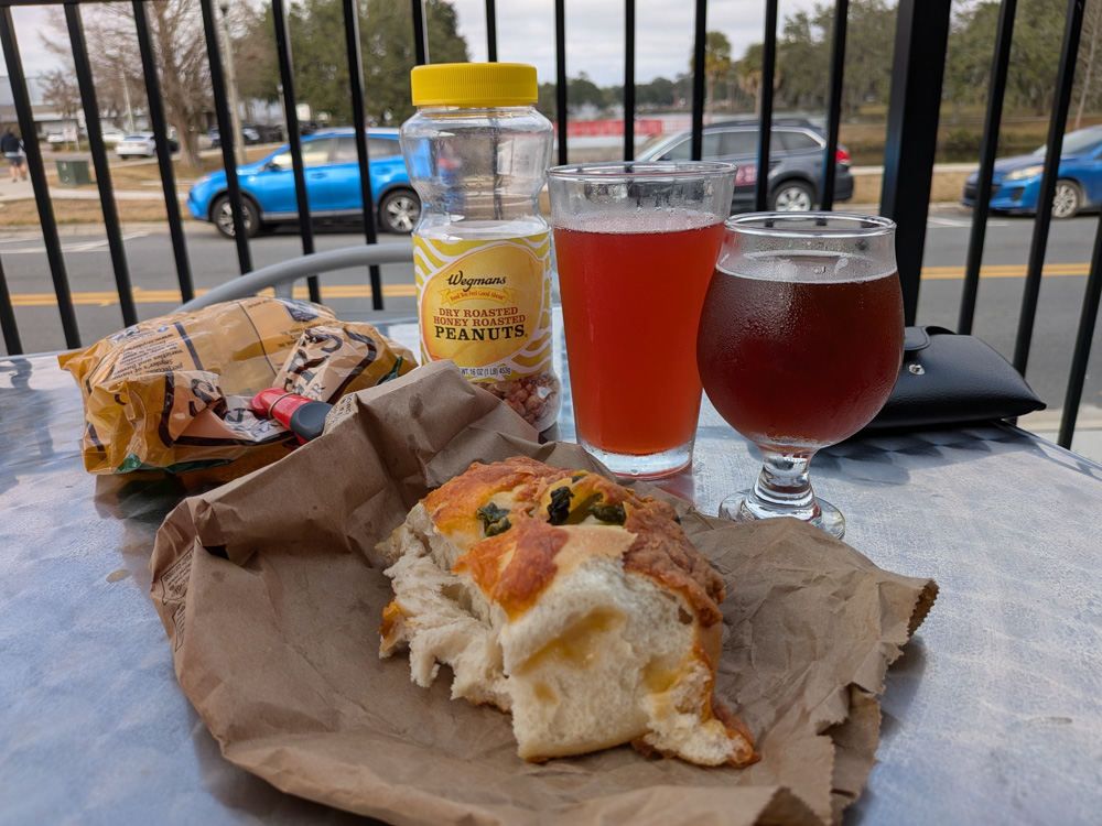 Infinite Ale Works – We stopped in Ocala at this brewery that is co-located with a coffee spot and restaurant. All share a large indoor and outdoor seating area. Eric got the Dragon fruit sour (very nice – and pink!) and I got the West Floridian OG (a Belgian-style quad). We sat outside in shade, listening to the dueling music from a few different places!