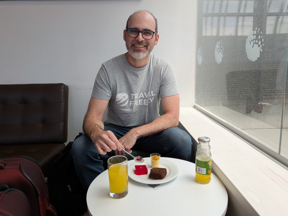 The Lounge in Medellin – fairly basic, a few snacks and drinks available self-serve, and a small menu available via QR code. We had a view of the security area below us.