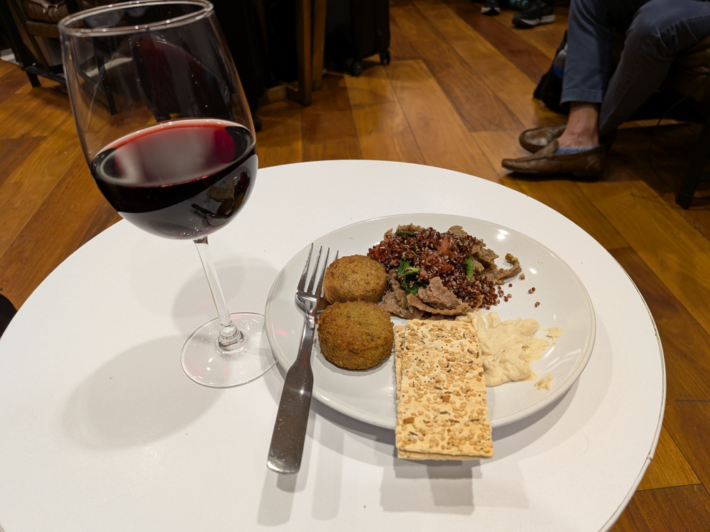 Turkish Lounge in Miami – we visited both going and returning. Both times there was a short line to get in, and then Leandra found us seats in the far corner. Overall they had a nice buffet, with falafel, hummus, rice and kabob, plus a number of salad options. At the self-serve bar they had several wines (including a sparkling), plus a nice dessert selection with Oreos, honey baklava, rice pudding, and others. On the minus side, the chairs were rather uncomfortable and the airport was cold, per usual for Miami.