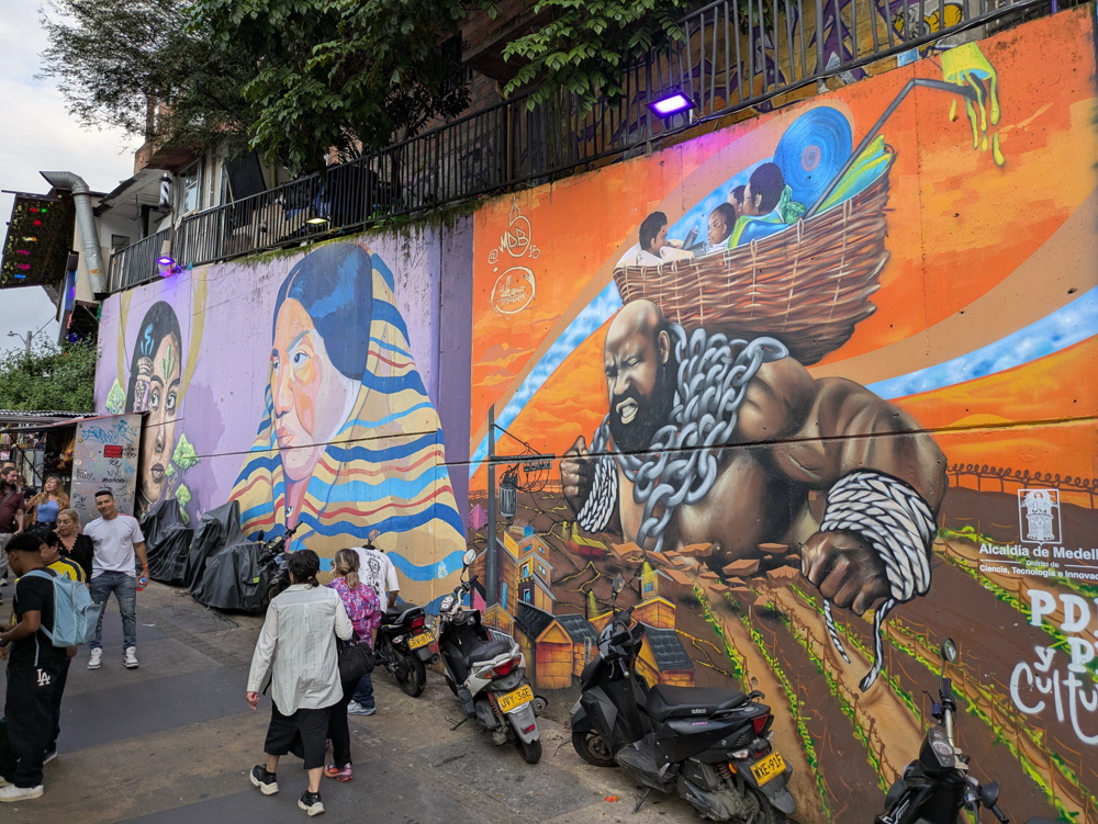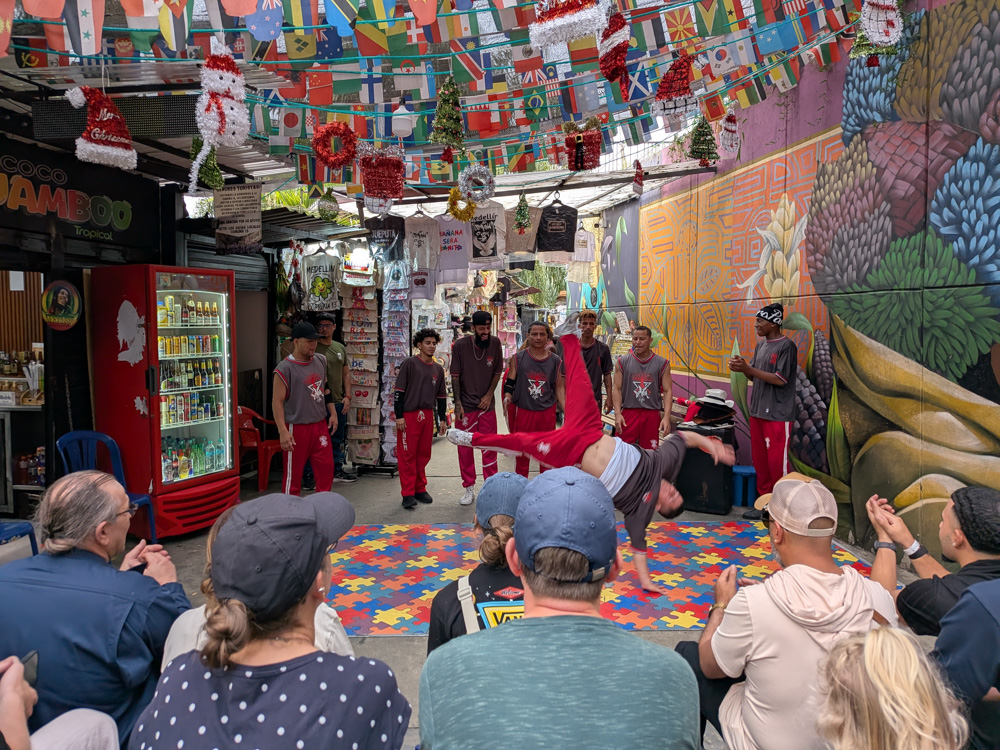 The group made a quick stop for a snack of arepas (corn cakes) and cheese, then continued onward to the Comuna 13 street art area, enjoying a 10 minute street dancing show on the way.